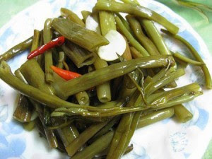 Có một món làm từ rau muống đơn giản, hấp dẫn mà nhiều bà nội trợ chưa để ý đến, đó là món dưa rau muống. Nguyên liệu gồm rau muống là chủ đạo,thêm ít đường, dấm, muối, ớt, tỏi. Cách làm món này rất dễ, ai cũng có thể làm được. - Rau muống chọn loại có cọng to và rỗng nhặt bỏ lá , chỉ lấy cọng , rửa sạch , nhúng tái qua nước sôi rồi thả ngay vào bát nước đun sôi để nguội , vớt ra cho vào rổ/rá sạch để ráo . - Xếp các cọng rau thẳng hàng với nhau, cắt thành từng đoạn dài khoảng 2-3 đốt ngón tay . - Pha nước đun sôi để nguội với đường , dấm , muối thành hỗn hợp nước chua mặn ngọt vừa miệng , cho thêm tỏi để nguyên nhánh và ớt để cả quả hoặc băm nhỏ . - Gắp toàn bộ rau muống đặt vào thố thủy tinh hoặc men , đổ nước vừa pha cho ngập rau , đóng nắp lại . Một , hai ngày sau , lấy dưa ra ăn , cọng dưa màu vàng , giòn , chua dịu , ngòn ngọt , cay cay . Bữa cơm có món dưa rau muống ăn kèm với thịt kho tàu hoặc thịt ba chỉ luộc hoặc đậu rán… thật là hấp dẫn . Theo dantri. |
